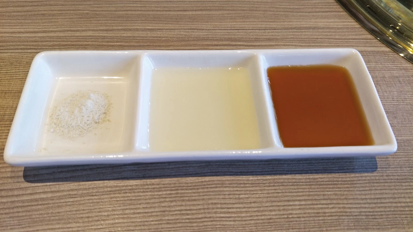 ▲這次的醬汁似乎有做過調整,由左至右依序為昆布鹽[口感變細緻帶點昆布香比較沒那麼鹹]、檸檬汁[個人偏愛可以少掉油膩感]、燒肉醬汁[健康取向淡淡鹹味的醬油]。